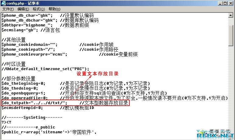 存放目录可自定义:你可以设置文本数据存放到哪个目录,包括WEB访问不到的地方。设置只需改e/class/config.php的参数即可,如图: