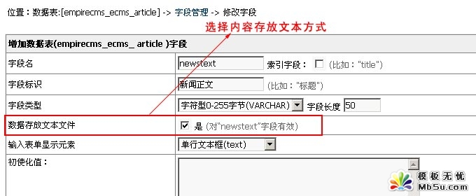 首先,你的字段名要为newstext;然后增加字段时选择“数据存放文本文件”选项即可,如下图: