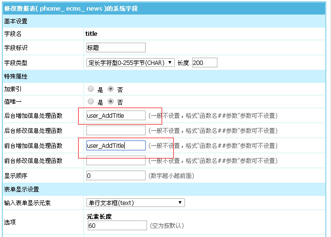 帝国CMS在增加/修改字段时可以设置“后台增加信息处理函数”、“后台修改信息处理函数”、“前台增加信息处理函数”、“前台修改信息处理函数”,可以分别设置对字段内容处理的函数,对于对字段内容存放格式有特殊要求的模型用得比较多。今天我们来简单讲解下处理函数制作格式。字段处理函数的具体设置位置如下图所示: