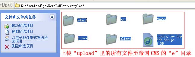 将接口包的“upload”目录里的文件夹及文件上传至帝国CMS的“e”目录里(注意是上传 upload 目录中的文件和目录,而不是上传 upload 目录本身)。
