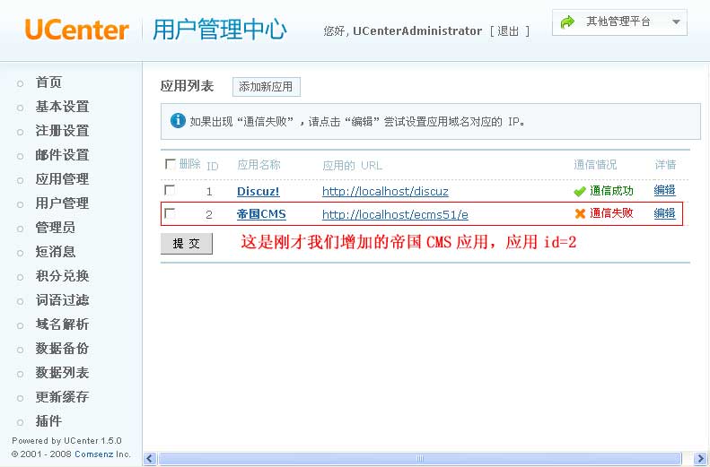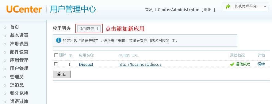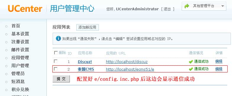 配置好Ucenter配置文件后,Ucenter的应用列表就会显示通信成功: