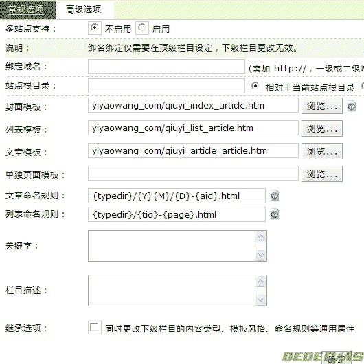 内容模型选定刚刚建立的那个模型,然后点高级设置,要设定相对应的模板。然后最下面的继承选项,选定之后整个栏目都会按这个设置顺承。