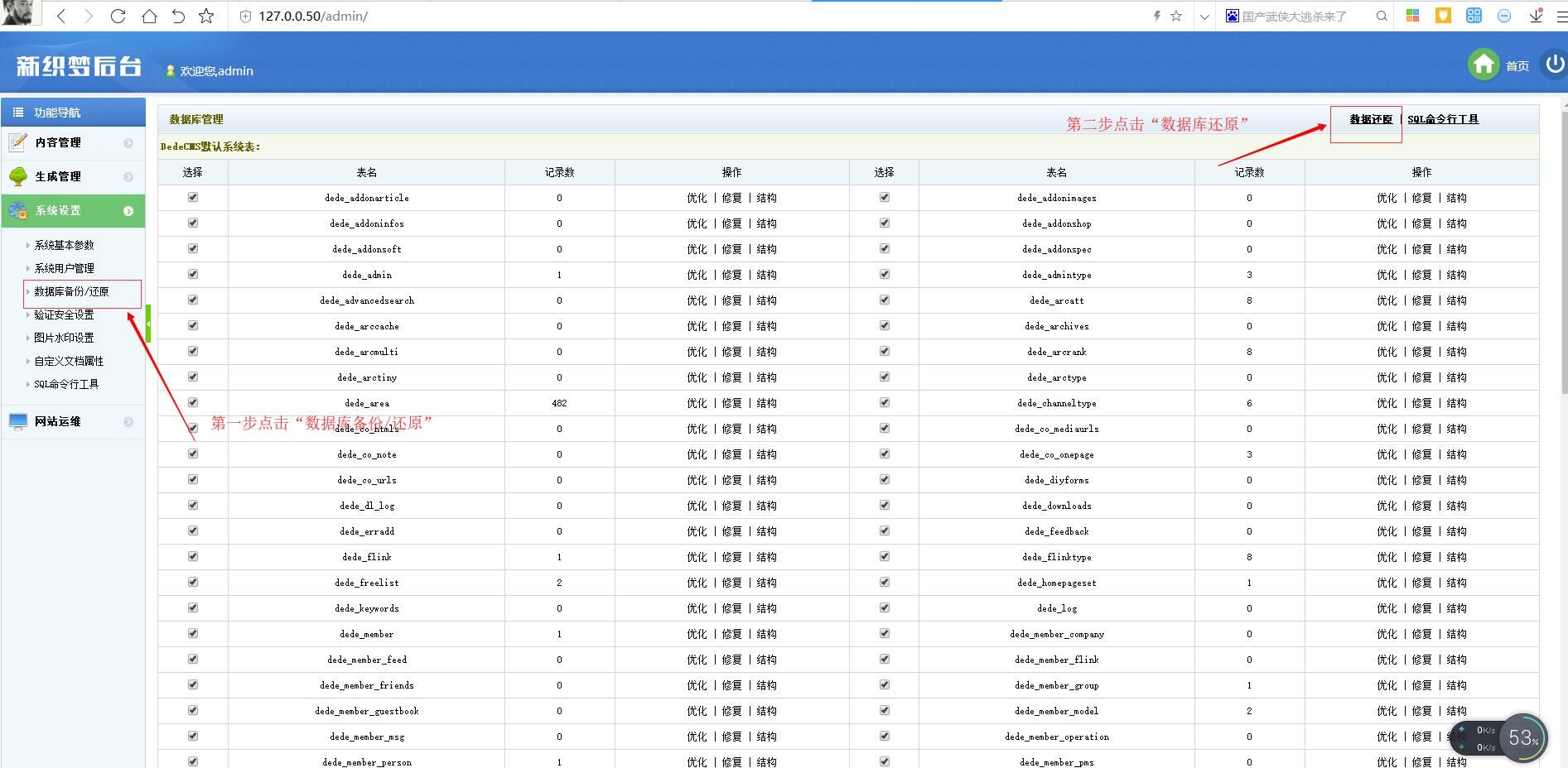 4.进入后台,点击“系统”-“数据库备份/还原”,执行“数据还原”即可。
