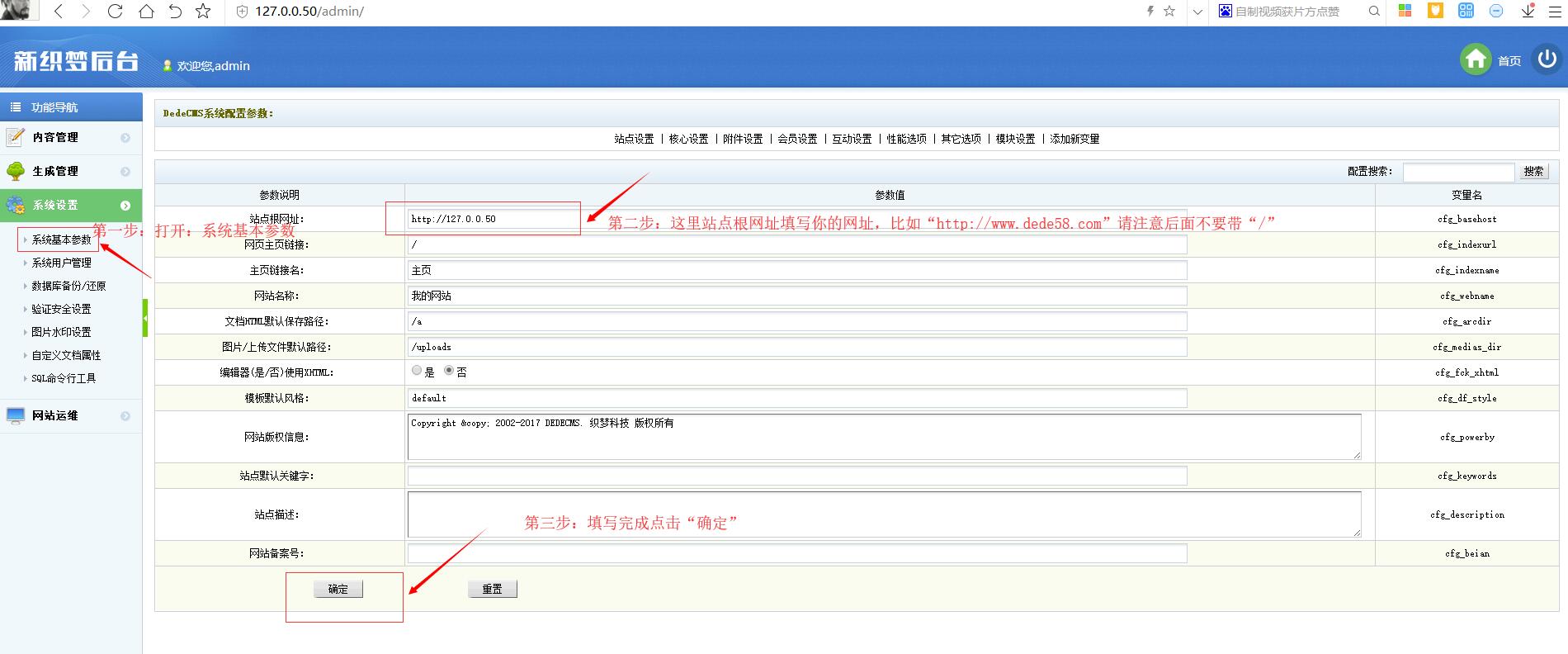 4.进 系统—系统基本参数—填好你的根网址  。。记住后面别加  /   和其他的参数。