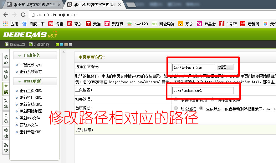 打开新增的文件:makehtml_homepage_m.htm  找到 36  和 48  行  修改他们的 value=‘’ 值  也就是他们的路径地址