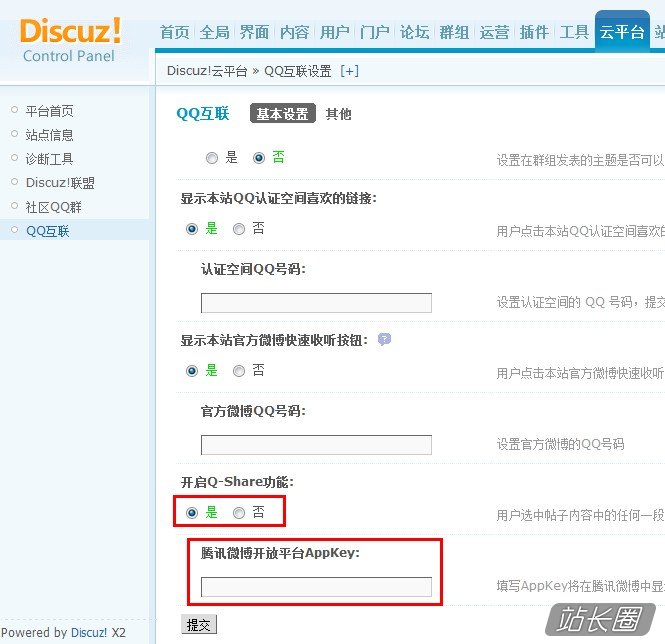 第二步:将通过审核的 AppKey 填写到 站点后台->云平台->QQ互联->开启Q-share功能->腾讯微博开放平台AppKey ,如下图: