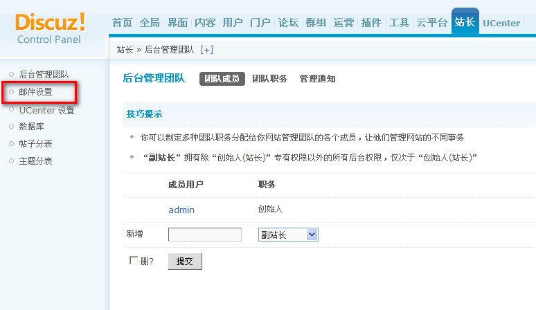 2、站点创始人登录后台 => 基本设置 => 站长设置 => 邮件设置 如下图所示: