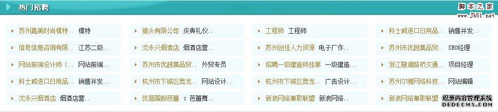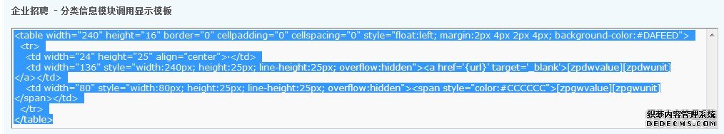 第三步,在Dreamweaver中设计分类信息的显示布局代码,并在要显示分类信息的地方插入上面保存的代码,最后复制代码到“分类信息模块调用显示模板”中。