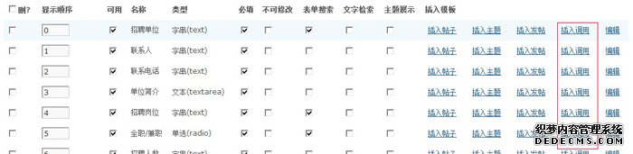 找到你想要在DIY页面显示的字段,比如:招聘企业,招聘岗位,招聘人数,在字段后面点击“插入调用”;