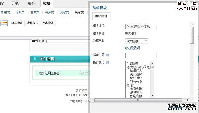 第四步,进入前台的DIY控制面板中,切换到高级模式,插入模块选择:展示类-静态模块,选择分类信息所在的版块,选择分类信息,其他的设置可以按照你的实际要求而定。