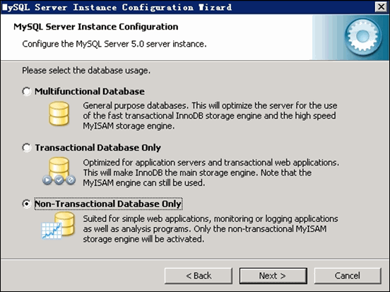 选择 MySQL 数据库默认存储方式:Non-Trans Only ( MYISAM) 如下图所示: