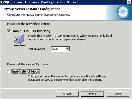 设定 MySQL 网络参数,注意:不要启用 Strict Mode! 如下图所示: