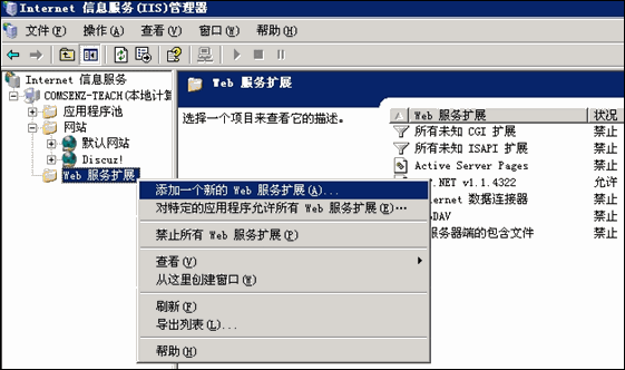 (4) 右键单击”Web 服务扩展”,添加 PHP 扩展支持。如下图所示: