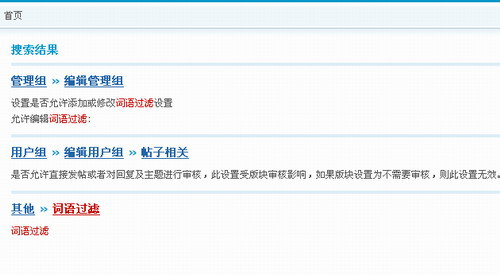 这里,可以看出来,后台对词语过滤有以上几项设置。首先是我可以控制管理组是否可以添加和修改关键字,第二个是在普通用户组里,可以设置用户组是否可以不受某些词语过滤的限制,第三个是设置词语过滤的位置。