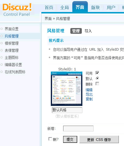 进入方法:后台 = > 界面 = > 风格管理,进入后可以看到如下图所示的页面: