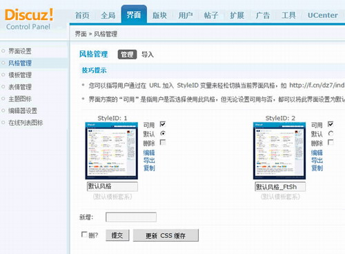Discuz!7.0是康盛创想(Comsenz)公司于2008年12月份发布的一款论坛BBS建站产品。在Discuz!7.0中,界面风格设置有了很大的改进。通过界面风格,站长可以设置论坛的默认风格,也可以设置页面的颜色、