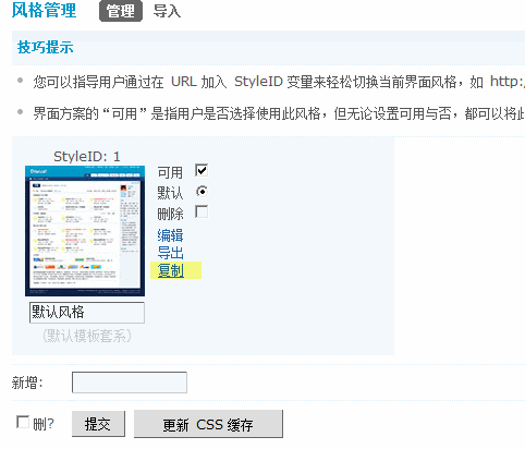 您可以对已有的风格进行可用、默认、删除等操作,也可以在新增的框内输入自己要新建的风格名,然后提交建立一个新风格。