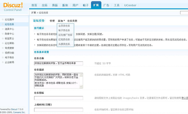 与以往版本相比,Discuz! 7.0.0 正式版的亮点之一是增加了任务系统。任务系统常见于各种计算机软件程序和大型网游。对于网游来说,游戏开发商为了活跃用户、提高用户与游戏、用户与用户之间的
