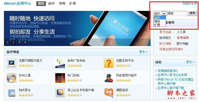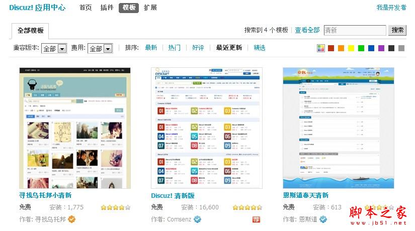 目前Discuz! 应用中心支持的应用类型有插件、模板与扩展。输入相应的关键词“清新”后共搜索到4个模板供站长选择。需要特别说明的是,Discuz! 清新版这块模板是官方出品并且很受欢迎,安装次数已经突破了16000次。