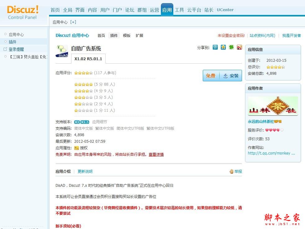站长找到适合的应用后,下一步就是安装了。Discuz! 应用中心支持一键安装与卸载,傻瓜式操作大大降低了站长的技术门槛。进入任何一款应用的详情页即可点击安装应用。例如,进入一款“自助广告系统”插件,可以看到醒目的安装按钮以及相关属性。