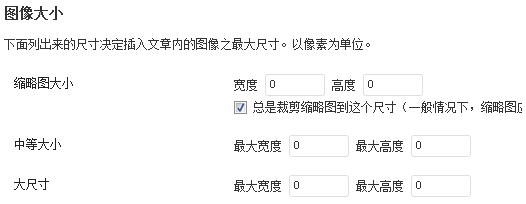 因为站点不需要显示这么多图片,只需要原图就OK了,所以就要修改下媒体设置。打开设置->媒体,将不需要的缩略图宽度高度都设置为0就可以了。如下图: