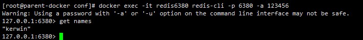 redis6380:容器名称、 redis-cli:redis自带客户端命令、-p 6380:指定redis端口、 -a 123456:指定redis密码登录